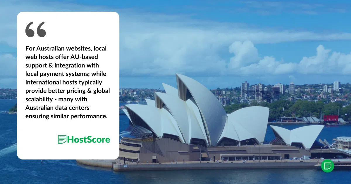 Both local and international hosting providers have advantages. Local Australia web hosts may offer customer support in your native languages, local payment options, and compliance with local regulations, while international providers typically have better infrastructure, scalability, and competitive pricing. If latency and legal compliance are major concerns, a local provider might be preferable, but a global host with local servers or CDN integration can also deliver strong performance.