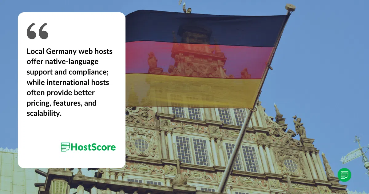 Both local and international hosting providers have advantages. Local Germany web hosts may offer customer support in your native languages, local payment options, and compliance with local regulations, while international providers typically have better infrastructure, scalability, and competitive pricing. If latency and legal compliance are major concerns, a local provider might be preferable, but a global host with local servers or CDN integration can also deliver strong performance.