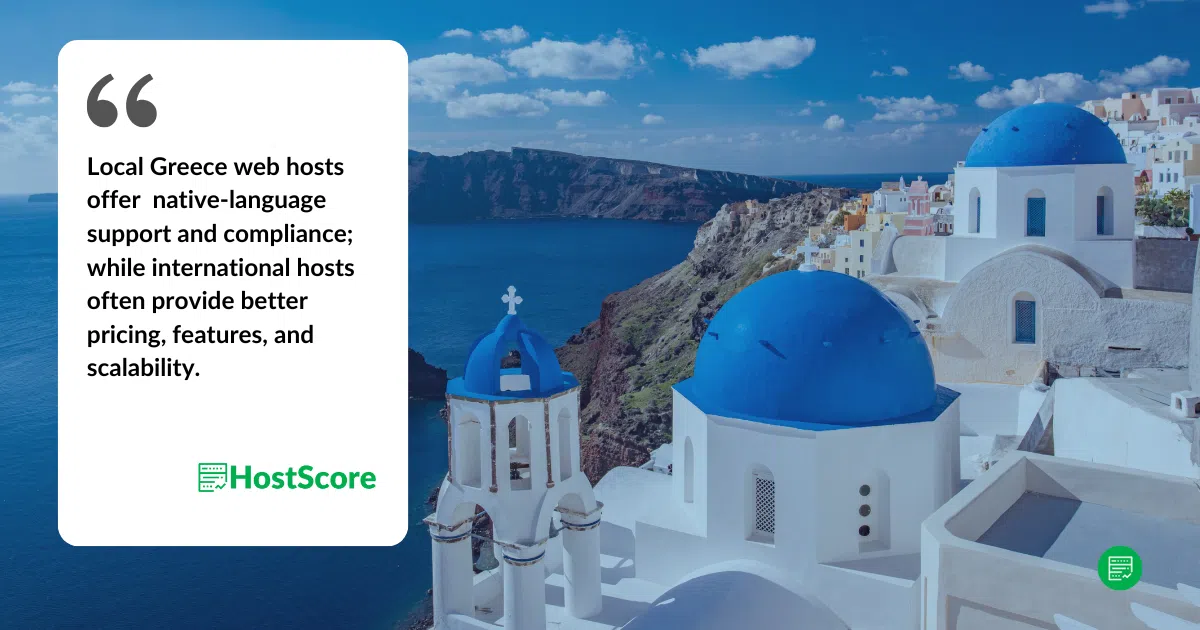 Both local and international providers serve Greek users, but they cater to different needs. International hosts leverage global infrastructure for lower costs and faster adoption of new technologies. Meanwhile, Greek hosts focus on providing local support, compliance with Greek business regulations, and ease of payment in EUR.