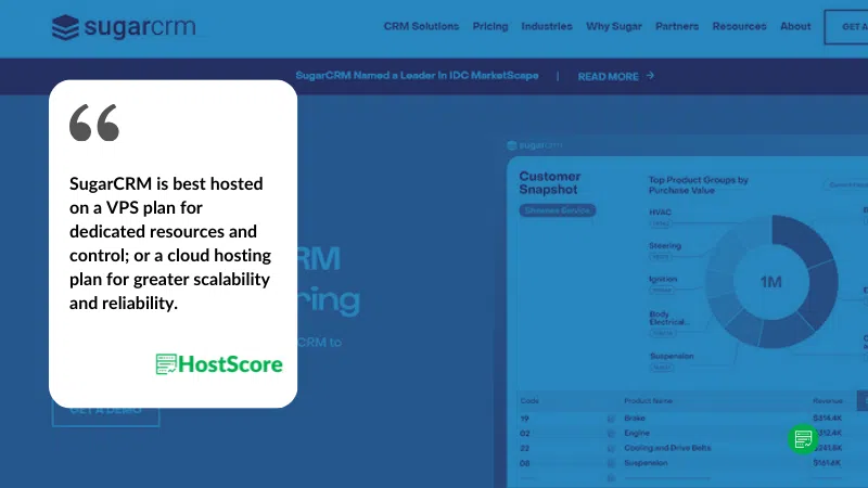 SugarCRM is a customer relationship management (CRM) platform for tracking and managing customer interactions and sales pipelines. SugarCRM is best hosted on a VPS plan for dedicated resources and control, or a cloud hosting plan for greater scalability and reliability.