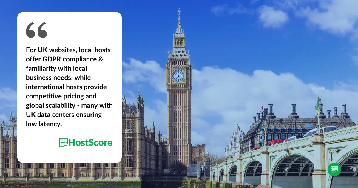 Both local and international hosting providers have advantages. Local United Kingdom web hosts may offer customer support in your native languages, local payment options, and compliance with local regulations, while international providers typically have better infrastructure, scalability, and competitive pricing. If latency and legal compliance are major concerns, a local provider might be preferable, but a global host with local servers or CDN integration can also deliver strong performance.