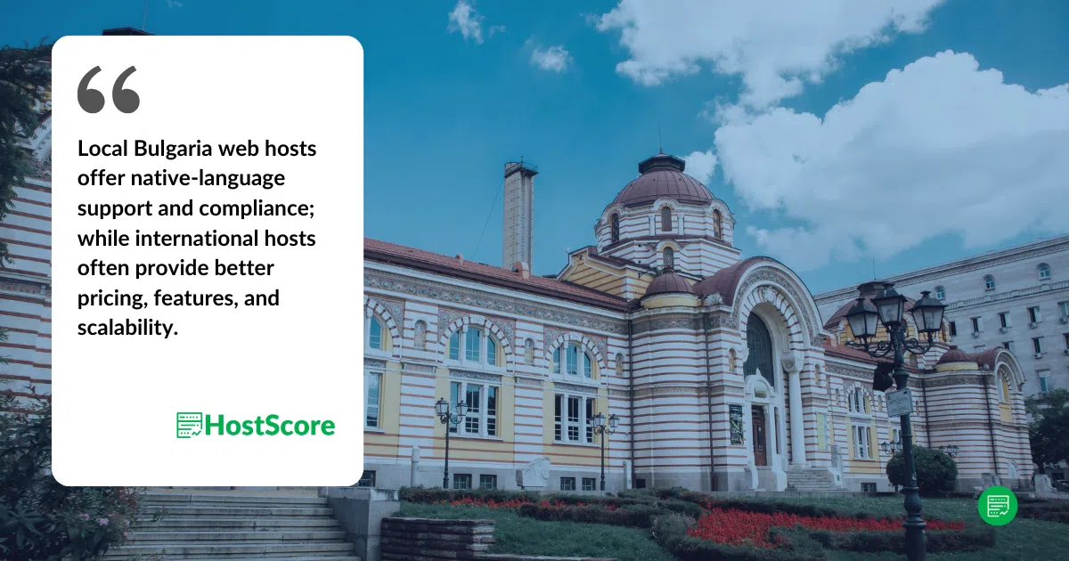 Memilih web hosting terbaik untuk situs web Bulgaria bergantung pada beberapa faktor, termasuk kinerja, dukungan lokal, dan kepatuhan terhadap peraturan. Sementara penyedia hosting internasional sering menawarkan harga yang lebih baik, teknologi canggih, dan pilihan lokasi server yang lebih luas, perusahaan hosting lokal melayani bisnis yang membutuhkan dukungan berbahasa Bulgaria, metode pembayaran lokal, dan kepatuhan terhadap GDPR.