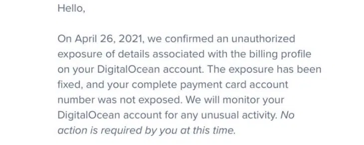 DigitalOcean, a cloud solutions provider, is notified its customers of a data breach that exposed their customers’ billing data. Two email versions seem to be in circulation from DigitalOcean.