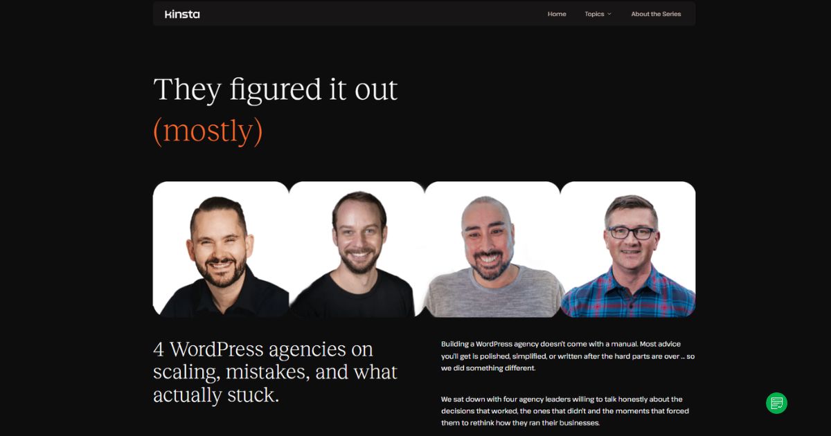 Kinsta is leaning into that shift with Agency Growth Insights, a new interview series that documents how real agencies operate at scale. The series starts with a simple question: what does it really take to run an agency when you’re managing dozens of client sites and multiple teams—and when infrastructure decisions have real consequences?