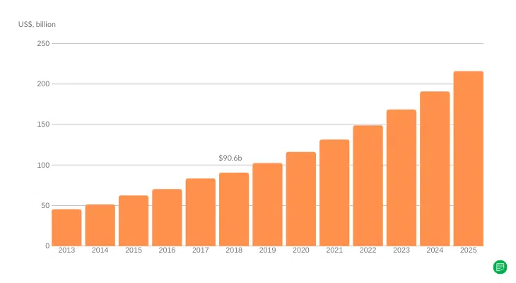 - The global web hosting market is expected to reach $216.59 billion by 2025 (was $90.64 billion in 2018), at a CAGR of 13.25%.