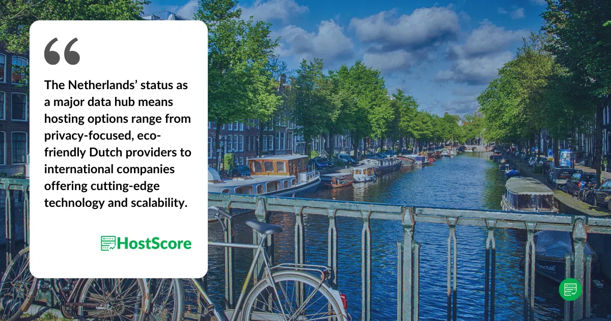 A Holanda é um dos destinos de hospedagem mais importantes da Europa, conhecido por sua infraestrutura robusta e compromisso com a sustentabilidade. O país abriga grandes provedores de nuvem e centros de colocation – mais da metade dos provedores de hospedagem que analisamos aqui. HostScore.net possuir pelo menos um data center no país – o que o torna uma escolha atraente para empresas que precisam de soluções de hospedagem confiáveis.