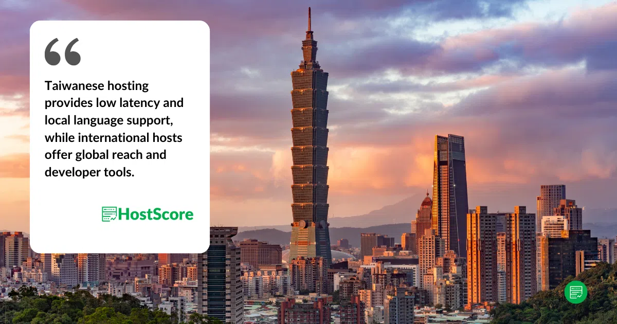 Hosts internacionais cobram de US$ 3 a US$ 20 por mês por hospedagem compartilhada, de US$ 20 a US$ 180 por VPS e de US$ 15 a US$ 250 por hospedagem em nuvem. Muitos têm data centers em Singapura, Japão ou até mesmo Taiwan, garantindo velocidades rápidas. Para usuários familiarizados com plataformas em inglês e que buscam infraestrutura escalável, provedores internacionais são uma ótima opção. Ainda assim, empresas locais focadas no mercado taiwanês podem se beneficiar mais de suporte local e ferramentas localizadas.