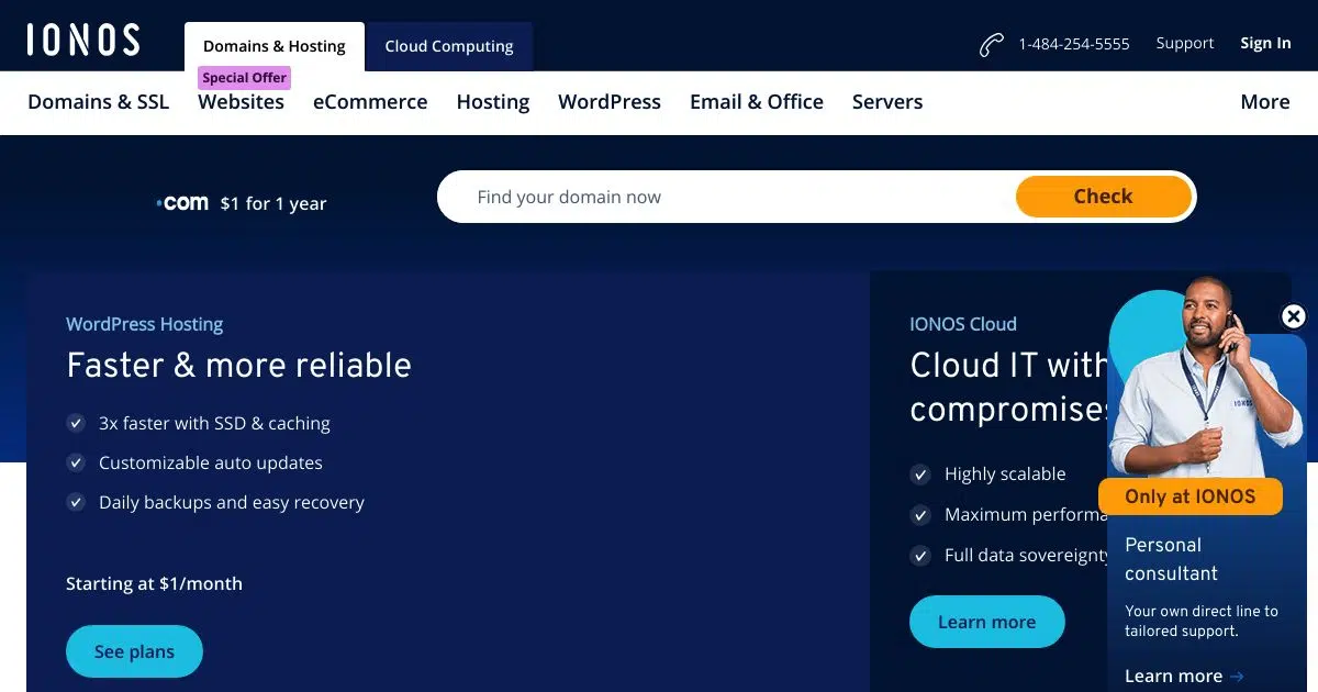 IONOS 是一家以价值为导向的主机提供商,提供快速、经济实惠的虚拟主机服务,专注于服务预算有限的用户,尤其是在欧洲。IONOS 提供免费邮箱账户、域名注册以及 SSL 捆绑到入门级计划中,只需支付较低的月费即可轻松开始使用。