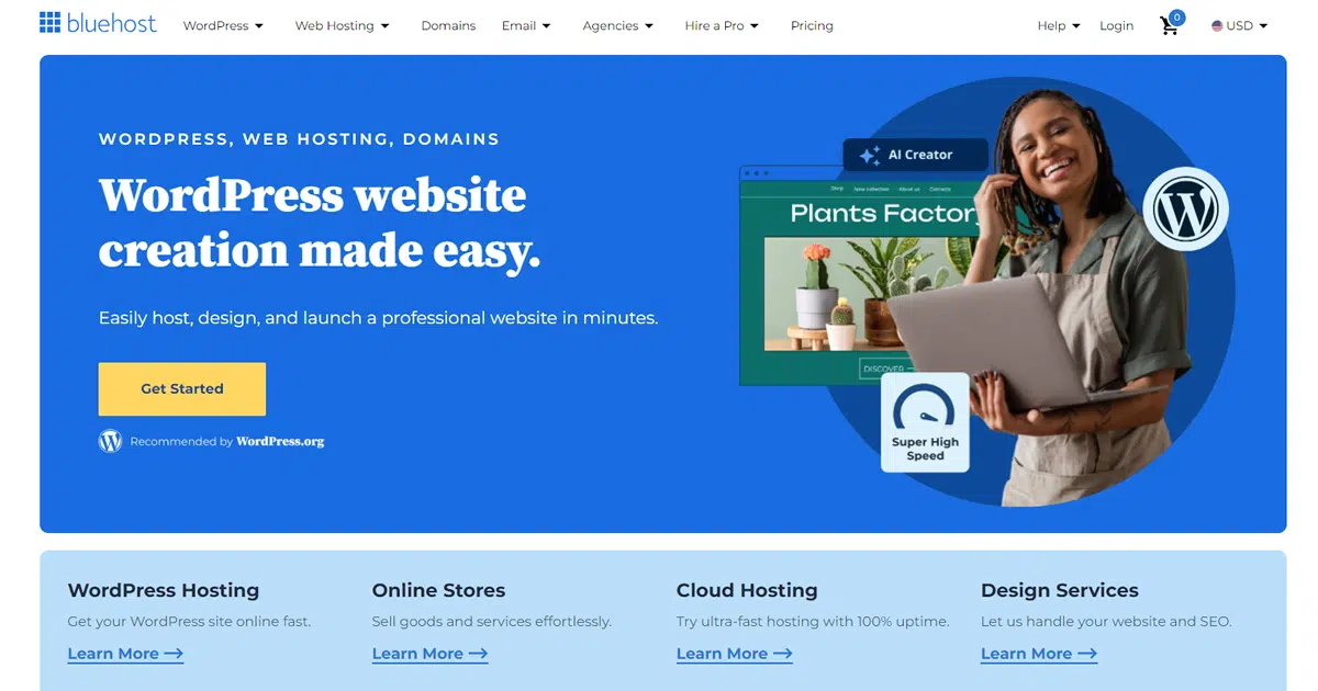 Bluehost 仍然是共享主機領域最知名的品牌之一,這在很大程度上要歸功於其強大的 WordPress 整合和適合初學者的設定。對於那些首次推出網站或部落格的人來說,Bluehost 提供了簡單的入門體驗,可以快速訪問 WordPress、電子郵件和基本的網站工具。
